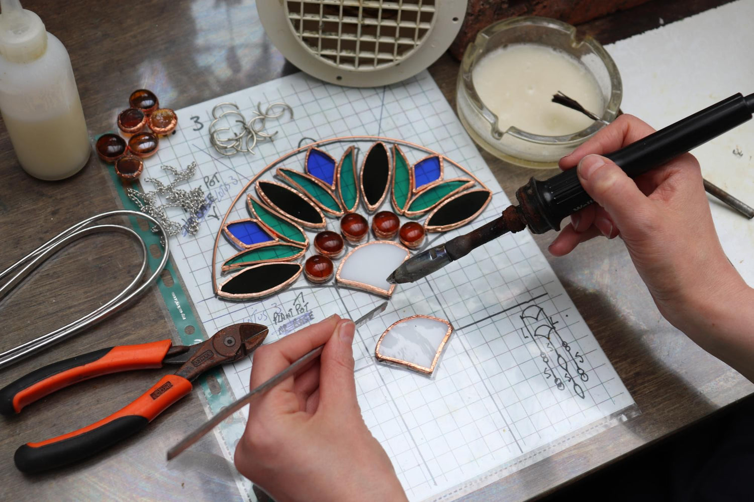 Designed and handcrafted by us using the traditional copper foil method developed Tiffany. Recently we have incorporated fused glass in our designs which make every piece individual.